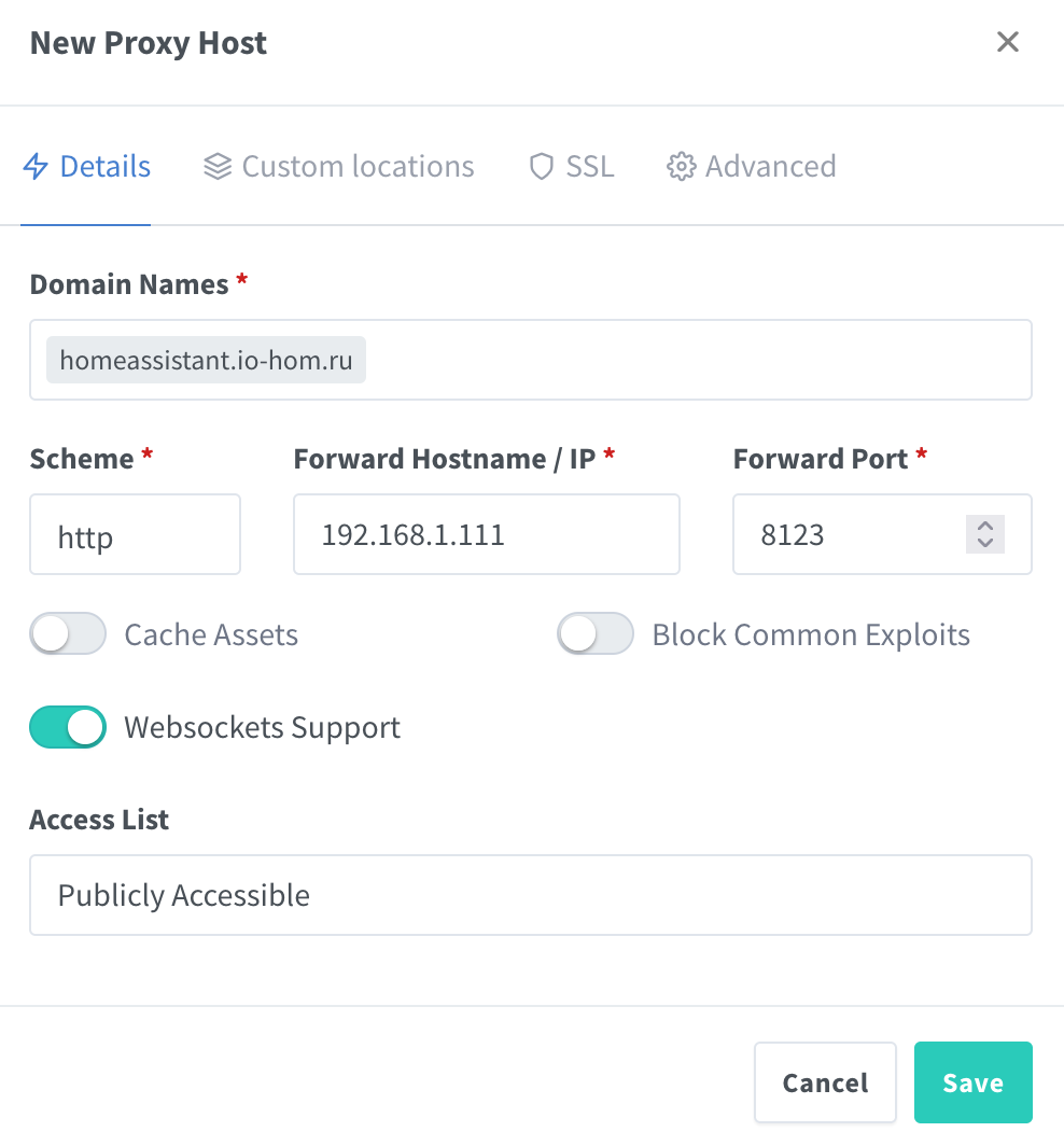 - в настройках Nginx Proxy Manager у нас будет указано что все запросы на домен homeassistant.iot нужно проксировать на IP-адрес